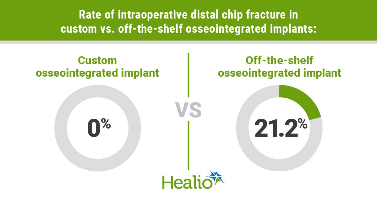 In comparison, results showed the historical control group had a 21.2% rate of intraoperative distal chip fracture. Researchers found all patients progressed to full weight-bearing without loosening, and there were no implant failures, deep infections or unplanned surgeries at an average follow-up of 6 months. Patients with a custom osseointegrated implant had statistically significant improvements in patient-reported outcome measures, according to the abstract.